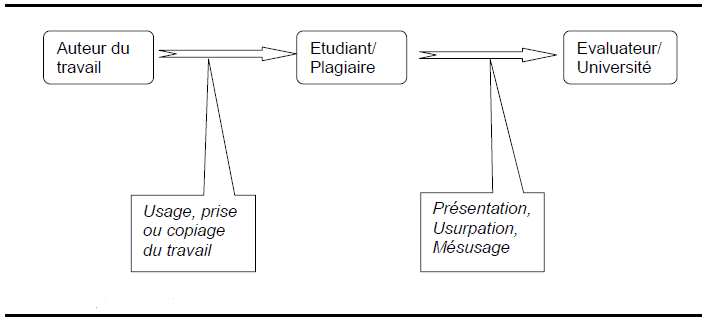 Au centre du processus se trouve l’étudiant plagiaire. Les éléments clés du plagiat sont en italique : l’usage ou le copiage, délibérément ou accidentellement pour tromper sur la paternité du travail. (Yeo, 2006)