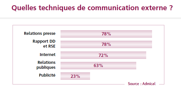 Ces résultats montrent que 78% des entreprises communiquent à travers leurs rapports de développement durable ou RSE. Cette enquête rejoint donc les conclusions évoquées plus haut sur le rapport entre mécénat et RSE : il existe un lien étroit entre ses actions qui demandent à être orientées dans la même direction. L’enquête nous dit même que « 67% de ces entreprises considèrent le mécénat comme faisant partie de leur politique de Responsabilité Sociale » et que « l’importance croissante des politiques de DD et RSE ont donné un élan à la communication du mécénat et autorise une parole plus libre sur le sujet » (ADMICAL, op.cit., p.7).