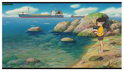 Elément important à noter, le graphisme de Ponyo assure un lien entre le graphisme des estampes traditionnelles japonaises et le manga, notamment grâce aux images de mers déchaînées, qui ne sont pas sans rappeler « La Grande vague » d’Hokusai.