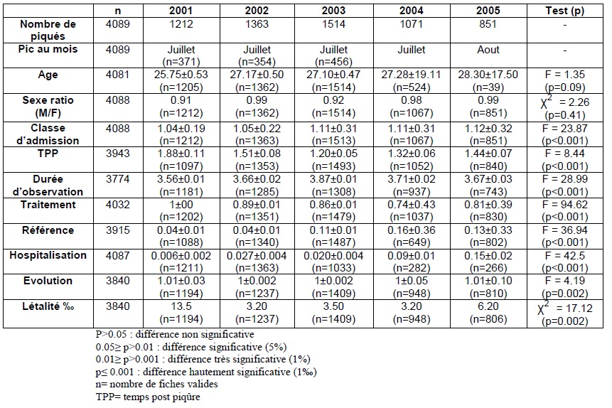 A la lumière de ces résultats, on observe que la différence entre les années est significative pour les caractéristiques suivantes : la classe à l’admission, le temps post piqûre, la durée d’observation, le traitement, la référence, l’hospitalisation et l’évolution à l’exception de l’âge et du sexe.