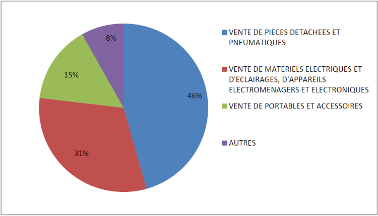 De l’analyse de cette figure, il ressort que les immigrants nigérians exercent plusieurs activités. Les vendeurs de pièces détachées et de pneumatiques sont les plus nombreux (46 % contre 31 % pour les vendeurs des matériels électriques et d’éclairages, des appareils électroménagers et électroniques). La vente de téléphones portables et accessoires occupe 15 % de la proportion enquêtée tandis que 8 % vivent du commerce des divers à savoir cures dents et ustensiles de ménage. Ces derniers sont généralement des ambulants.