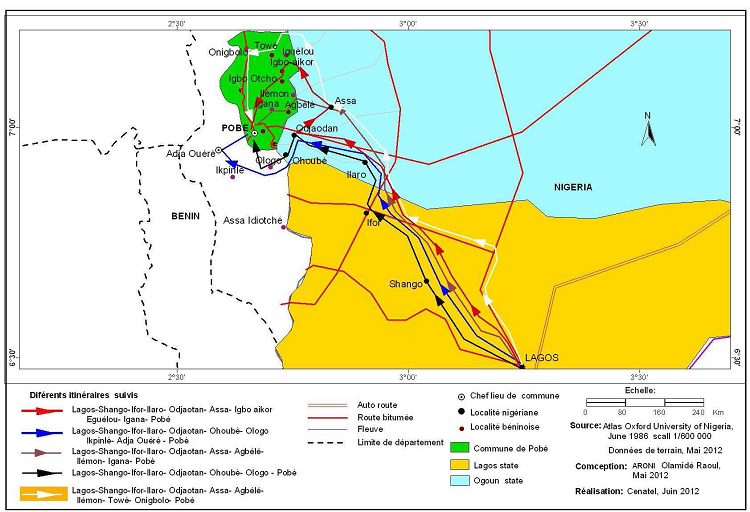De l’examen de la figure, il ressort que les contrebandiers pour échapper aux contrôles douaniers empruntent les pistes de désertes rurales dans la commune de Pobè. Ces pistes qui étaient à l’origine utilisée par les trafiquants d’essence frelatés servent aujourd’hui aux immigrants pour contourner la douane.