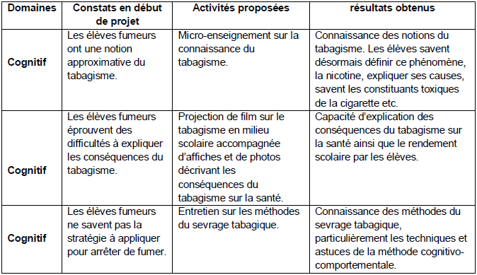 En fin de projet, les élèves ont pu maîtriser les notions liées au tabagisme. Aussi connaissent-ils désormais ses dangers et sont imbus du comportement à adopter pour en sortir définitivement. Ce constat est encore plus perceptible à travers leur motivation à un arrêt définitif et leur niveau de dépendance (voir annexes 3 et 4).