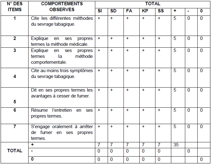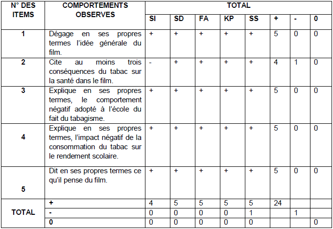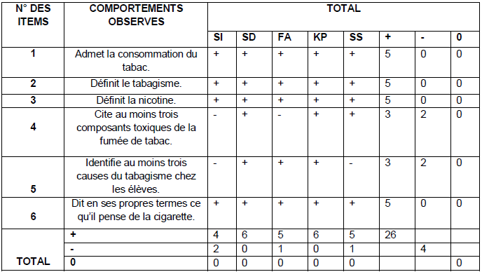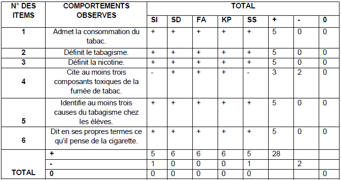Ainsi, SD et KP se distinguent de leurs camarades avec chacun 6 comportements positifs et 1 comportement négatif. Suivent SI et FA qui ont chacun un score de 5/7, avec 1 comportement non observé chez FA. Les 2 comportements négatifs de SI sont dus au fait qu’il n’a cité qu’une seule méthode de sevrage, et n’a pas suffisamment expliqué la méthode médicale. Idem pour SS. FA présente 1 comportement négatif car il n’a pu citer que 2 symptômes du sevrage tabagique. Son comportement non observé au niveau de l’item 1 traduit son absence aux deux premières séances d’activité et son manque de concentration lors de la troisième séance d’activité. Il semblait plus préoccupé par le calcul des moyennes du second semestre, qui devait se dérouler après l’activité. Le comportement négatif de KP s’explique par le fait qu’il a partiellement résumé l’entretien. Le comportement négatif de SD et SS à l’item 7 est dû au fait que leur engagement oral à cesser de fumer n’était pas suffisamment expressif au contraire de SI, FA et KP qui ont entamé l’arrêt définitif de la cigarette dès la fin de la première séance d’activité.