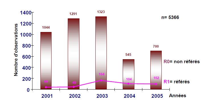 Ces résultats montrent que le nombre de référés augmente entre 2001 et 2003 puis diminue de 2003 à 2005.