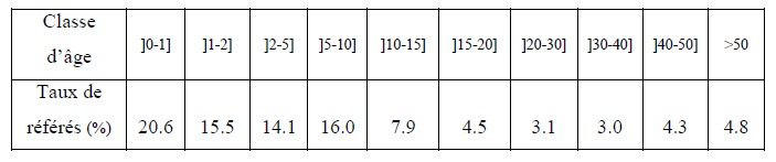 Les référés sont surtout des enfants d’âge entre 2 et 15 ans avec un maximum entre 5 et 10 ans. Cependant le taux de référés spécifique à chaque classe d’âge révèle que la référence est plus importante chez le nourrisson et qu’elle diminue avec l’âge.