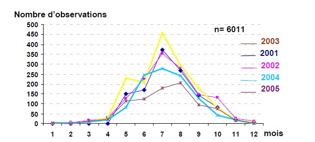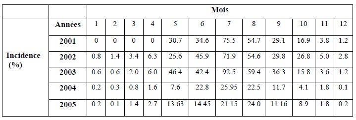 Les résultats de la figure 72 et du tableau XVII montrent que les cinq courbes ont la même allure avec un pic en juillet pour quatre années et un pic en août pour 2005. La fréquence des piqûres le mois de juillet est de 31% en 2001, 26% en 2002, 30% en 2003, 26% en 2004 et 21% en 2005 ; soit une moyenne de 27%. En 2005, la fréquence des piqûres au mois d’août est de 24%