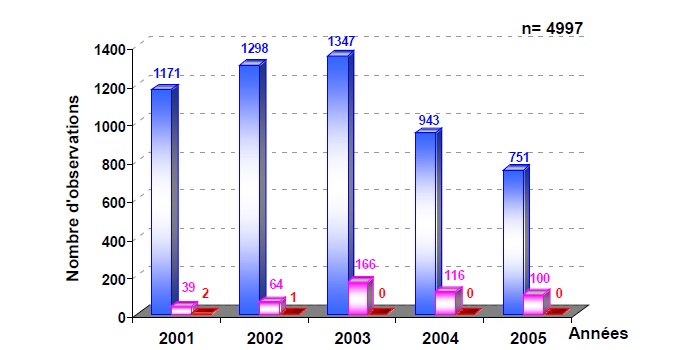 Le pourcentage de classe I diminue de 2001 à 2003 pour se stabiliser jusqu’en 2005 : 97 %, 95 %, 89 %,89% et 88% ; par contre la classe II augmente jusqu’en 2003 puis se stabilise : 3%, 5%, 11%, 11% et 12%. Très peu de patients arrivent en classe III : seuls 2 cas en 2001, 1 cas en 2002 et aucun en 2003,2004 et 2005.