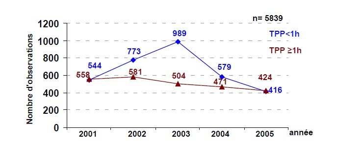 Le délai d’arrivée diminue entre les années 2001- 2002- 2003, puis augmente en 2004- 2005. En effet, le pourcentage de TPP inférieur à 1 heure augmente de 2001 à 2003, puis diminue jusqu’en 2005 : 49% en 2001, 57% en 2002, 66% en 2003, 55% en 2004 et 50% en 2005, et le délai supérieur ou égale à 1 heure diminue.