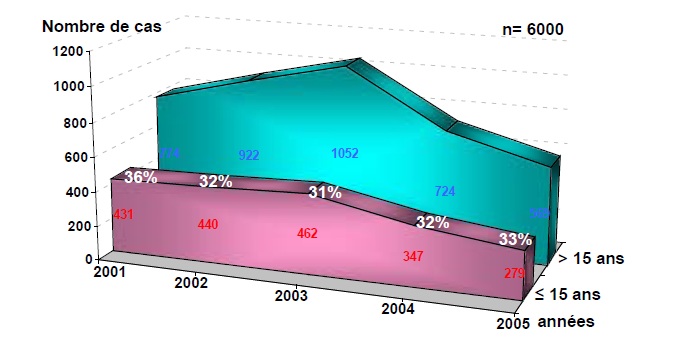 Le pourcentage d’enfants d’âge inférieur ou égal à 15 ans varie entre 31% et 36% selon l’année. Il est respectivement de 36%, 32%, 31%, 32% et 33% en 2001, 2002, 2003, 2004 et 2005.