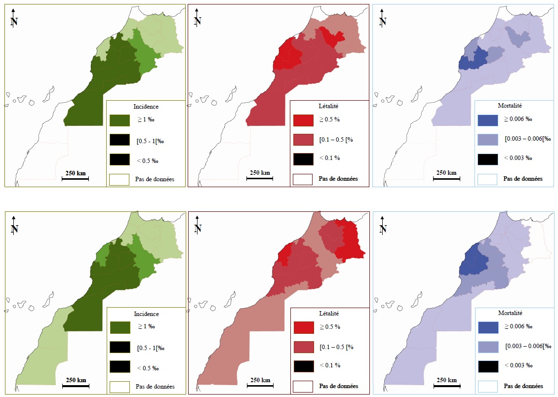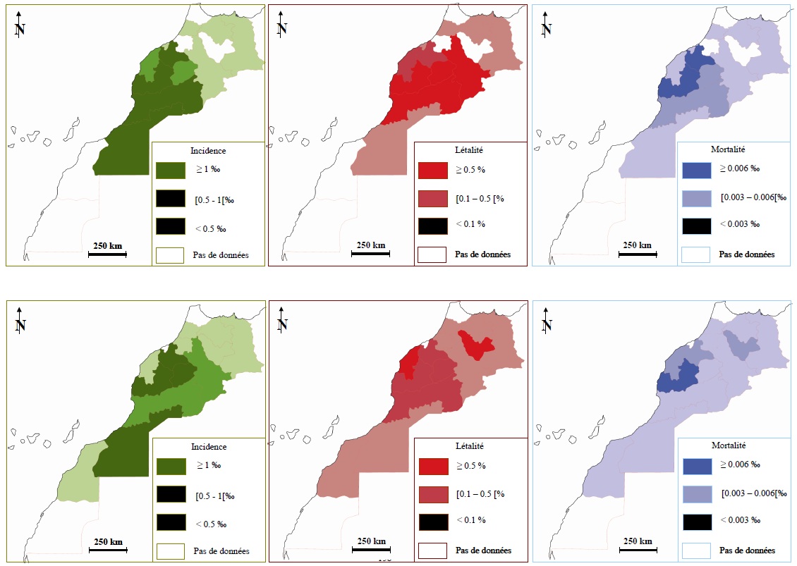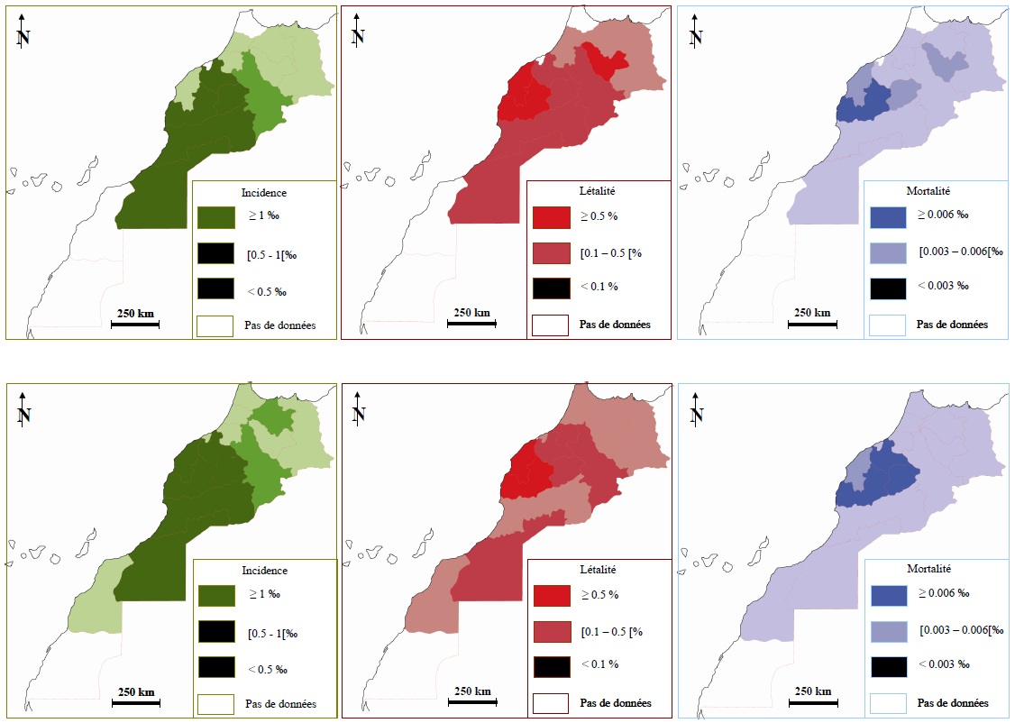 En 2003, l’incidence est élevée à Guelmim, Souss, Marrackech, Tadla, Chaouia et Meknès (I ≥0.5‰), la létalité est moyenne dans ces régions à part Marrackech qui avec Doukkala et Fès ont une forte létalité (L ≥0.5%). Quand à la mortalité, elle est très élevée à Marrackech (M ≥0.006‰), suivi par Tadla, Doukkala et Fès (M [0.003- 0.006[), elle est faible ou nulle dans le reste des régions (<0.003‰).