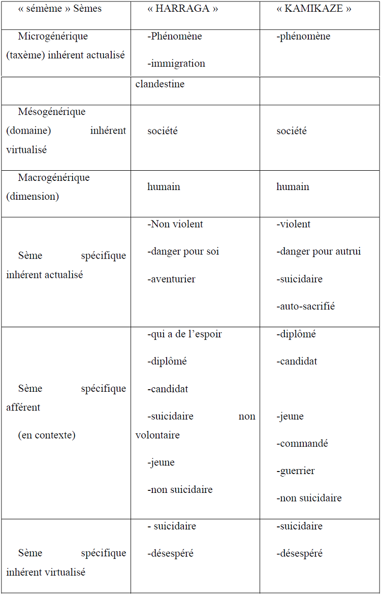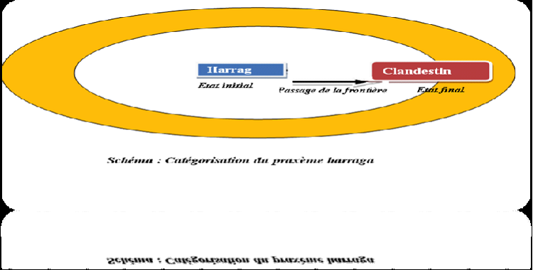 Notre intérêt pour la sémantique catégorielle et la praxématique se justifie par cette volonté de montrer comment, par le biais de la dénomination et de la catégorisation, le locuteur-producteur du discours arrive à construire le sens du praxème harraga(46).