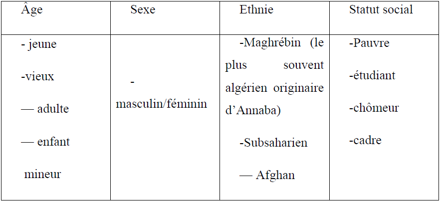 Dans notre tableau, se trouvent différentes classes, comme celle de l’âge, du sexe, de l’appartenance ethnique, ainsi que la classe sociale de l’individu « harraga » ; cela sera bien sûr fait en prenant en compte des discours recueillis. En second lieu, nous reprendrons les constats faits et nous allons procéder à une stigmatisation de l’individu harraga.