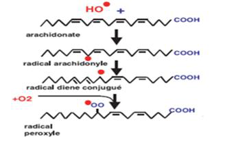 La peroxydation des lipides résulte de l’attaque par des radicaux libres des acides gras polyinsaturés (acide linoléique, linolénique, arachidonique). Cette réaction est à l’origine de dommages tissulaires responsables de cancers, de maladies inflammatoires, du vieillissement et de lésions vasculaires comme l’athérosclérose. [Raccah., 2004].