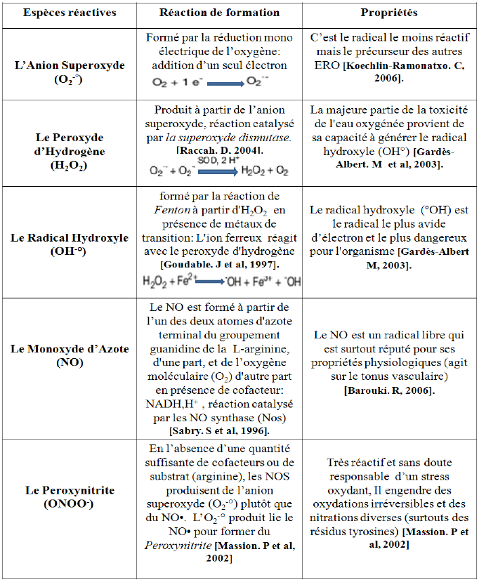 Les principales ERO entrant dans les processus physiopathologiques humains sont regroupés dans le tableau II :