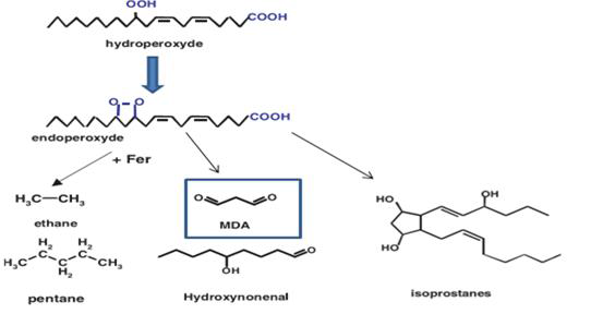 Une partie des hydroperoxydes formés vont être réduit et neutraliser par le glutathion peroxydases, Les hydroperoxydes non réduits vont se décomposer facilement en différents produits, les plus étudiés sont les aldéhydes : malondialdéhyde (MDA), l’hydroxynonenal et les isoprostanes (cf. Figure 10) [Therond., 2006]