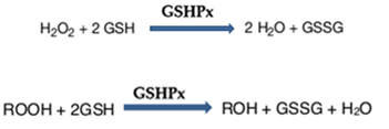 La GSHPx est localisée dans les milieux extracellulaires, le cytosol et les mitochondries [Ghisolfi-Marque., 2006]. Ces enzymes réduisent le peroxyde d’hydrogène et les hydroperoxydes lipidiques en utilisant le glutathion réduit (GSH) sur lequel elles transfèrent l’oxygène, le transformant en glutathion oxydé (GSSG) [Goudable et al., 1997]