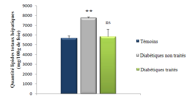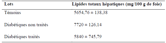 A travers ces résultats, nous relevons que le taux des lipides totaux hépatiques des rats du lot diabétiques non traités est augmenté de 27 % et ce de manière hautement significative (p < 0.01) comparé au rat du lot témoins non diabétiques et cela nous fait suggéré que ce diabète expérimental (alloxanique) a induit une accumulation accrue des lipides au niveau du foie des rats diabétiques. Ces résultats rejoignent ceux de Dhandapani et al. (2002) et Prince et al. (2004) qui ont trouvés des taux de lipides au niveau du foie des rats diabétiques significativement élevés par rapport aux rats témoins non diabétiques.