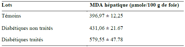 Les taux du MDA au niveau du foie des rats des 3 lots (témoins, diabétiques témoins et diabétiques traité par le décoté du Z. album) sont représentés dans le tableau et la figure.