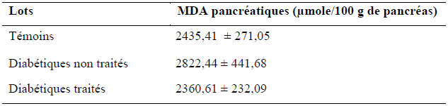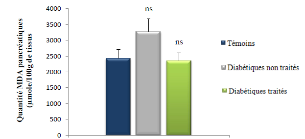 La lecture de la figure montre que le taux du MDA pancréatiques chez les rats diabétiques non traités est augmenté de 25 % par rapport aux rats du lot témoins (p > 0.05).