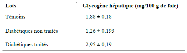 Ainsi, à travers ces résultats, nous suggérons que le décocté de Zygophyllum album favorise le stockage du glycogène au niveau du foie. Selon El Ghoul et al. (2011), cette plante agirait en augmentant l’utilisation du glucose par certains organes cibles de l’insuline notamment le foie et de ce fait favoriserai la glycogénogenèse hépatique.