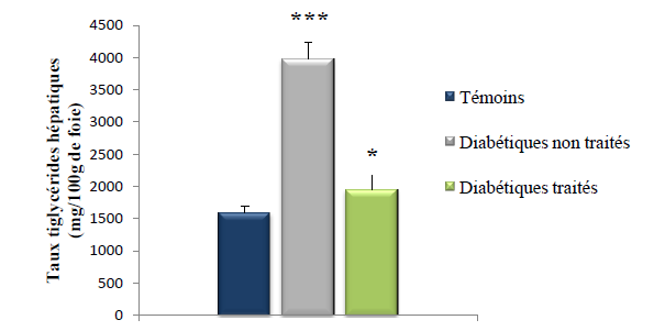En revanche, chez les rats du lot diabétiques traité par le décocté du Z. album, nous notons que les triglycérides hépatiques sont diminués de 50 % (p < 0.05) par rapport aux triglycérides hépatiques des rats du lot diabétiques non traités. Ce résultat prouve que le traitement a fait décroitre la synthèse des triglycérides dans le foie des diabétiques traités.