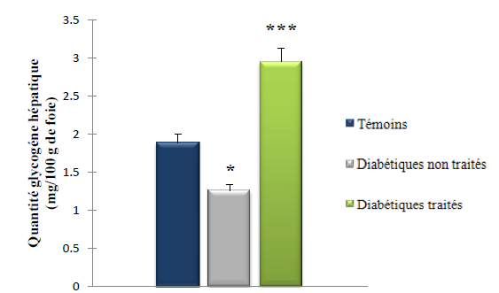 Par contre, chez les rats du lot diabétiques traités, le taux du glycogène hépatique est augmenté d’une façon très hautement significative (p < 0.001) par rapport au glycogène hépatique des rats du lot diabétiques non traités. Nous notons aussi que la quantité du glycogène hépatique des rats diabétiques traités est significativement (p < 0.05) supérieure à cellle des rats témoins. Cet effet a été déjà observé avec d’autres plantes considérées comme antidiabétiques. En effet Kebièche (2009) a rapporté une augmentation du glycogène hépatique sur des rats diabétiques traités par des flavonoïdes extraient d’une plante Ranunculus repens L ; il en est de même pour Soussi et al. (2009) avec Eucalyptus globulus.
