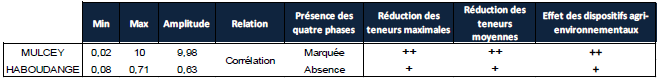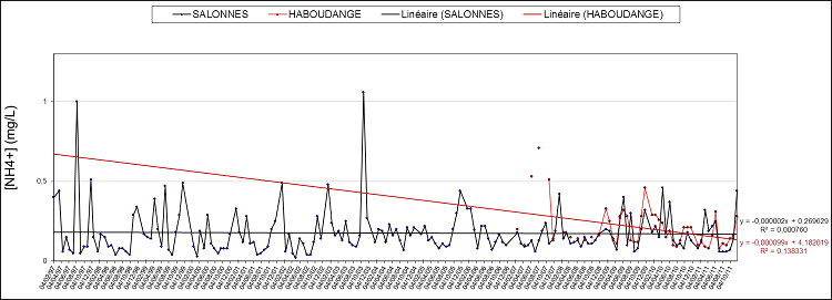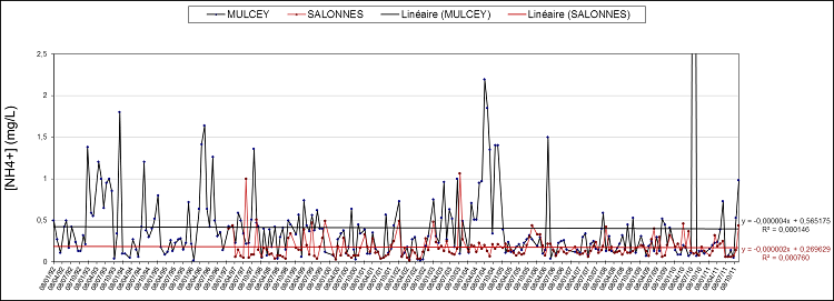 Seuls mai 2006 et avril – octobre 2011 rompent la tendance en raison de conditions climatiques particulièrement chaudes et sèches (parmi les plus extrêmes des cinquante dernières années). Les droites de tendance sont difficilement exploitables en raison de données discontinues à Haboudange, et de la valeur extrême de 10 mg/L en aout 2010 à Mulcey qui fausse la tendance générale. En testant l’influence de cette valeur sur la droite de tendance – en la remplaçant par exemple par une valeur moyenne haute de 0,5 mg/L – on obtiendrait une différence significative de la pente associée :