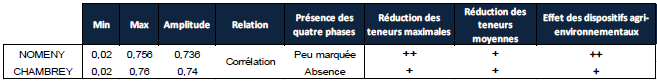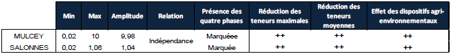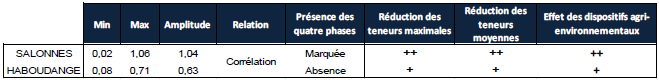 Les deux stations choisies représentent respectivement le secteur amont et l’aval de la petite Seille et possèdent les caractéristiques propres à ces zones. Rassembler ces deux stations permet de mettre en évidence des caractéristiques propre à la zone Natura 2000. Les deux tracés sont relativement indépendants, Salonnes étant plutôt dominée par l’influence de la zone amont de la petite Seille. On observe également un effet amont-aval avec des concentrations plus faibles pour Salonnes. Les quatre phases caractéristiques recherchées sont présentes et permettent d’apprécier l’influence des mesures ACNAT et MAE dans un premier temps, du dispositif CTE dans un second temps et du dispositif Aquae Seille et MAEt dans une troisième période. La zone Natura 2000 est le seul secteur de l’étude où la significativité de l’influence des dispositifs agri-environnementaux concerne les deux stations.