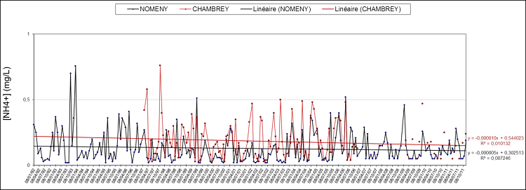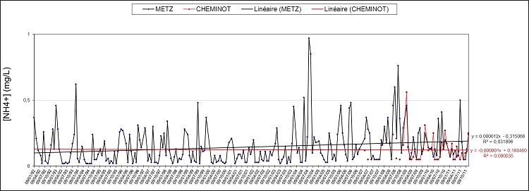 De manière générale, la pollution par l’ammonium sur le bassin versant de la Seille montre une amélioration peu marquée, comme en témoignent les droites de tendance des stations Mulcey, Salonnes, Chambrey et Nomeny. La baisse des valeurs maximales et des fluctuations est relativement significative tandis que la baisse des teneurs annuelles moyennes est plus limitée. Seule la station Metz ne suit pas cette tendance, probablement à cause de sa particularité de station urbaine aval soumise aux rejets urbains et industriels. Il semblerait toutefois que les dispositifs agri-environnementaux mis en oeuvre sur le bassin versant de la Seille aient un impact général relativement significatif sur la pression exercée par les effluents organiques issus de l’élevage et donc sur la pollution exercée par cette forme non-stable de l’azote qu’est l’ammonium.