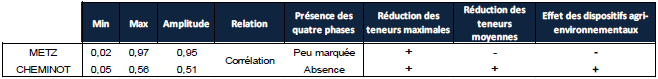 Les deux stations disponibles pour le secteur aval appartiennent à des paysages différents : Cheminot dans un paysage agricole où la pression liée à l’élevage est moins importante qu’en amont, et Metz dans un paysage urbain où la qualité de l’eau est éventuellement influencée par les rejets urbains et industriels.
