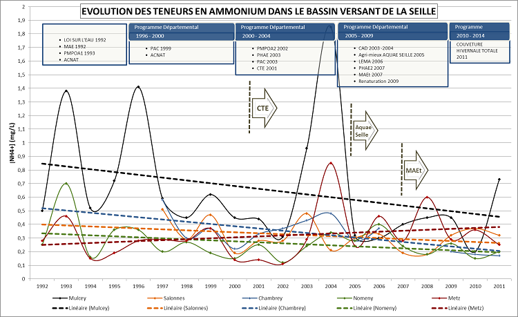 Les teneurs en ammonium relevées dans la Seille sont relativement élevées et présentent des fluctuations importantes. La valeur minimale constatée est de 0,11 mg/L à Metz en 2002 et la valeur maximale de 1,85 mg/L à Mulcey en 2004. Trois pics se démarquent et concernent la station Mulcey en amont du bassin versant : 1,38 mg/L en 1993, 1,41 mg/L en 1996 et 1,85 mg/L en 2004.