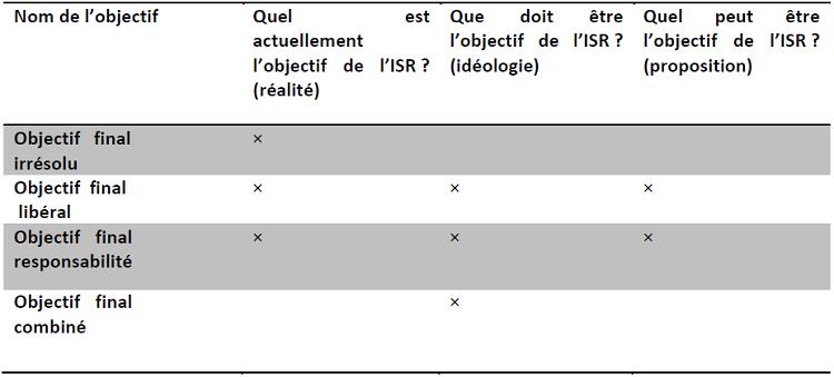 Nous constatons que selon les auteurs, l’ISR peut revêtir actuellement les trois objectifs finaux. Il est sans doute possible que selon la société de gestion (ou de courtage), l’objectif soit différent, il est donc plus réaliste de penser que l’objectif de l’ISR reste indéterminé pour le moment et que les finalités libérale et responsabilité s’affrontent dans le cadre d’une norme.