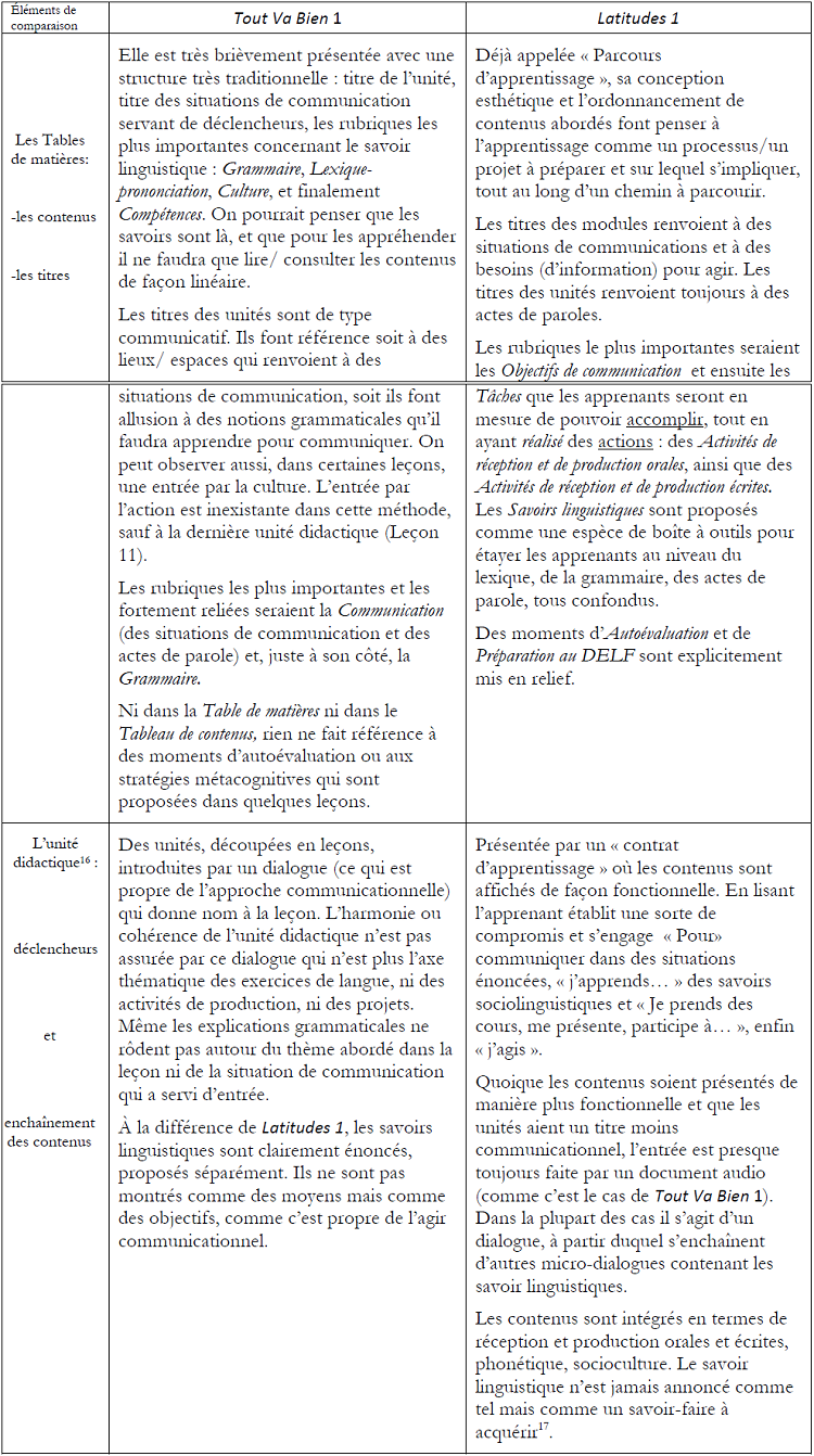 Les types d’entrées, utilisées pour découper et relier en segments ordonnés le processus d’enseignement-apprentissage du FLE, se sont succédées tout au long de l’histoire. Les entrées ont été choisies en fonction de chacun des moments de l’évolution des courants didactiques : entrée par la grammaire-méthodologie traditionnelle, entrée par le lexique-méthodologie directe, entrée par la culture-méthodologie active, entrée par la communication- méthodologie audio-visuelle/ communicationnelle, entrée par l’action-méthodologie/approche actionnelle(15). Analysons dans les méthodes Tout Va Bien 1 et Latitudes 1, la transition vers l’approche actionnelle par les types d’entrées qu’elles proposent.