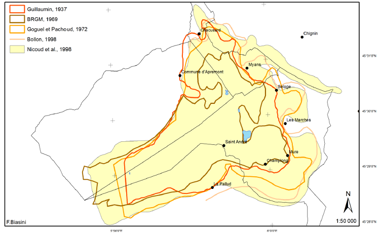 26 « Des reconnaissances de terrains effectuées pour la délimitation des AOC Vins de Savoie, crus Apremont et Abymes, puis pour l’étude des tracés TGV, nous amènent à étendre plus largement le glissement ». (Nicoud & al, 1998, p. 43). Les sondages en question n’ont pas pu être consulté.