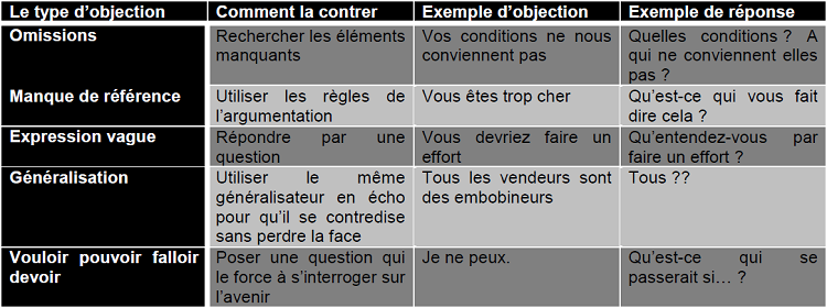 Bien qu’elle soit considérée comme une étape dans la méthode de Vincent Fauri, l’objection n’arrive pas qu’au moment de la conclusion. Elle peut intervenir à tout moment dans l’entretien. Yves Lellouche nous en donne quelques exemples à la page 147 du Chapitre 13. Lors de la présentation, les objections interviennent dès la première tentative d’argumentation du vendeur : « Nous somme la société la plus performante » Lors de la découverte, le vendeur pose une question fermée inductive : « Vous aurez surement remarqué que… » Lors de la reformulation, le vendeur ne reformule pas, il affirme : « C’est donc la conclusion à laquelle vous arrivez comme tous nos clients… ». Lors de l’argumentation, l’objection arrivera si l’argument n’est pas suivi de preuve : « C’est le meilleur rapport qualité/prix ! ». Lors de la conclusion, si le prix est présenté trop isolément, c’est-à-dire sans lui adjoindre les conditions de vente, le vendeur à droit au célèbre : « C’est trop cher ! ». L’objection révèle souvent d’un problème de communication. Nous allons détailler les différentes formes qui peuvent révéler : la présence d’omissions, le manque de références ou d’index, les expressions trop vagues, les généralisations, les verbes vouloir, savoir et devoir.