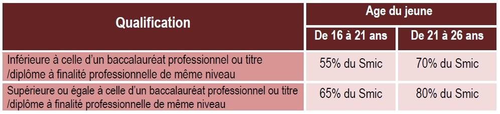 Les jeunes âgés de moins de 26 ans perçoivent une rémunération calculée en fonction du Smic dont le montant varie selon l’âge et le niveau de formation du bénéficiaire. A défaut de dispositions conventionnelles plus favorables, la rémunération est ainsi fixée :