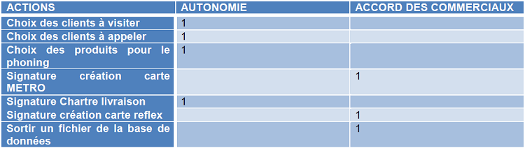 Voici un tableau qui reprend une liste d’activités et d’actions sur lesquelles je pouvais agir soit en totale autonomie soit avec leur accord.