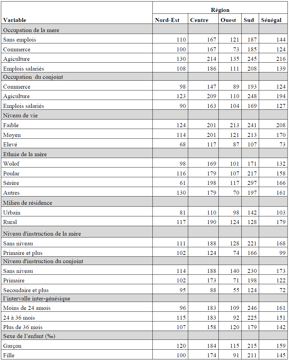 Par contre, le Sud enregistre le quotient le plus élevé (213 ‰). Le meilleur quotient qu’enregistre la région de l’Ouest (Dakar et Thiès) par rapport aux autres régions pourrait s’expliquer par sa forte urbanisation et ses bons taux de couverture en infrastructure et personnel qualifié de santé. A cela on peut ajouter le fait que la région Ouest bénéficie de conditions naturelles non favorables au développement des maladies respiratoires et diarrhéiques, contrairement à la région Sud qui est humide et favorable au développement d’agents pathogènes. Meme si par ailleurs la région de résidence constitue une variable pour laquelle on relève d’importants différentiels. L’effet mécanique de la région sur la mortalité des enfants reste à vérifier d’où la nécessité de voir l’effet des variables économiques, culturelles dans la suite de cette partie.