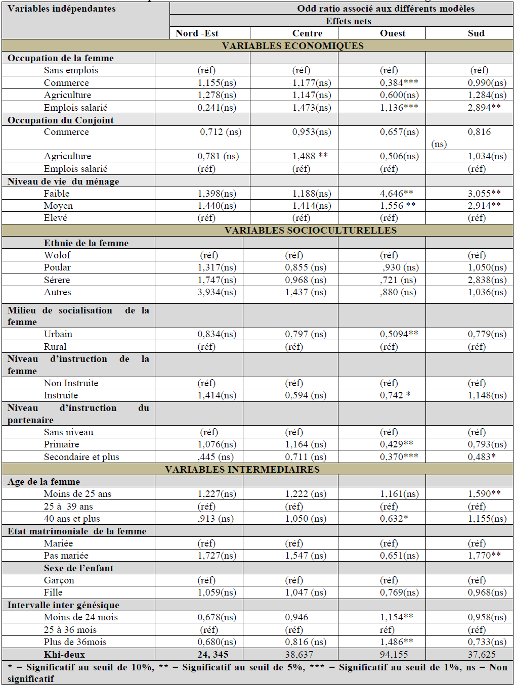 Au niveau national, toutes les variables économiques sont significativement associées à la mortalité des enfants au seuil de 5%, mais leurs significativités varient selon les régions. Les résultats montrent qu’à l’exception de la région du Nord, l’activité économique de la mère est une variable associée à la mortalité des enfants de moins de cinq ans au seuil de 5%.