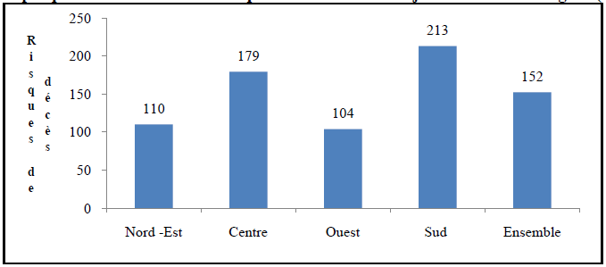 Le graphique 4.1 nous montre les risques de décès infanto-juvénile en fonction de la région. La relation entre la mortalité infanto-juvénile et la variable région est significative au seuil de 5 %. Pour l’ensemble du pays on constate que le risque de décéder avant cinq ans est assez élevé (152 ‰). La région Ouest enregistre le meilleur quotient (104 ‰), suivie de la région Nord-Est (110 ‰) et du Centre (179‰).