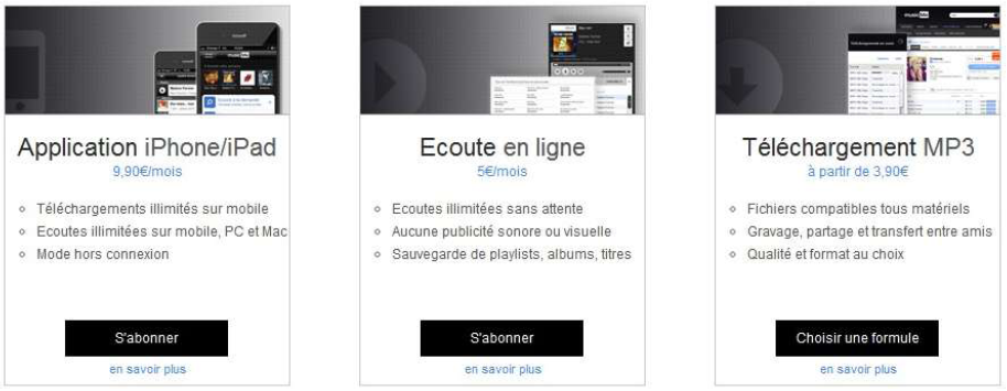 – La formule MP3 qui propose de télécharger des fichiers (que je n’étudierai pas ici) à 3,90 € par mois.