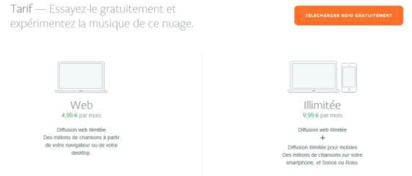 – Une offre premium pour 4,99 € par mois permettant d’écouter de manière illimitée, sans publicité et avec un son de haute qualité.