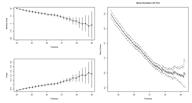 Figure 3.6 Graphes des paramètres d’échelle et de forme en fonction des différents seuils (courbes gauche) et la fonction moyenne des excès (courbe droite) pour la détermination du seuil, le seul retenu ici est u = 28.0C.