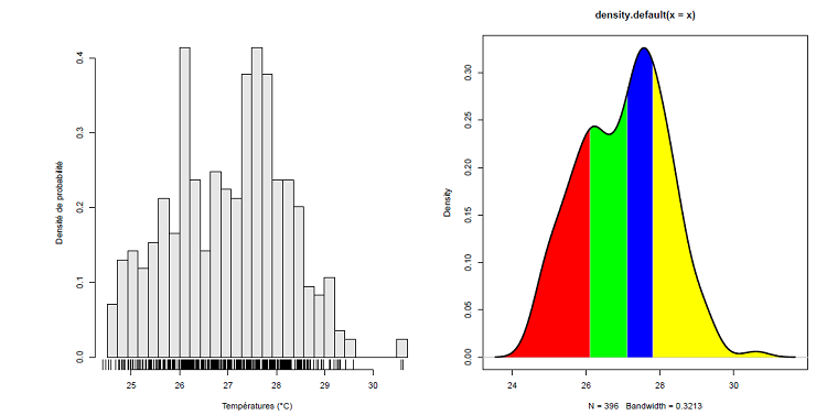 Figure 3.2 Histogramme de la distribution des températures moyennes (à gauche) et la courbe de la densité de probabilité de la distribution représentatif des cinq quartiles (à droite)