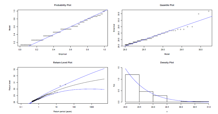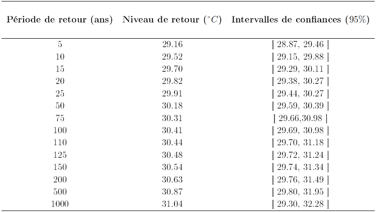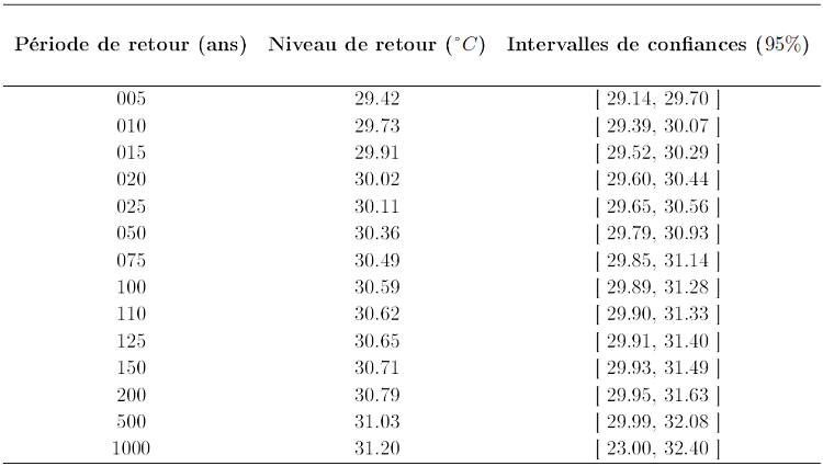 Il est possible avec ces résultats d’estimer les intensités de probables niveaux de retour de températures extrêmes (mois les plus chauds) dans 5, 10, 25, 50, voir même 100 ans et plus. Nous pouvons ainsi estimer la période de retour associée au pic mensuel de température moyenne de 30.7°C observé en Février 1998. Elle serait de l’ordre du bicentenaire (200 ans), c’est-à-dire en Février l’an 2198.