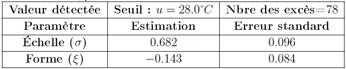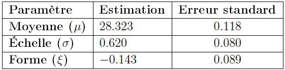 Il s’agit d’un échantillon de 33 pics annuels, donc la valeur la plus élevée est 30.7°C, observée en Février 1998, le mois le plus chaud des 33 années d’observations. La valeur la plus basse des valeurs extrêmes est de 27.3°C en Avril 1976. Les valeurs des paramètres du modèle sont estimées par la méthode du maximum de vraisemblance et les résultats sont consignés dans le tableau 3.3.