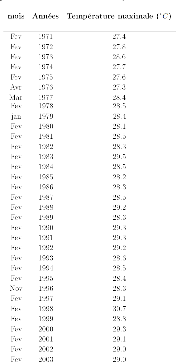 Table 3.2 Températures maximales annuelles issues des moyennes mensuelles à Douala 1971-2003