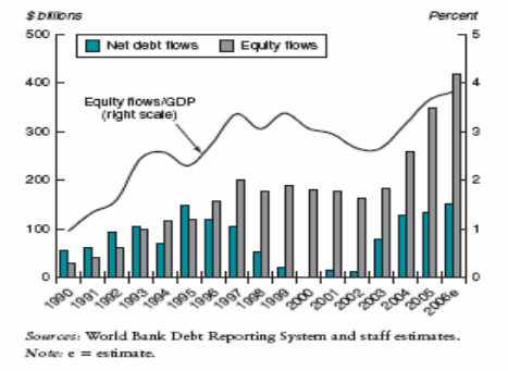 Ce graphique illustre bien l’augmentation remarquable des flux de capitaux sous forme d’actions privées durant la période de 1990-2006 ce qui démontre des niveaux d’intégrations grandissants, Là encore, on retrouve consolidation de notre intuition de départ concernant la tendance mondiale vers plus d’intégration.