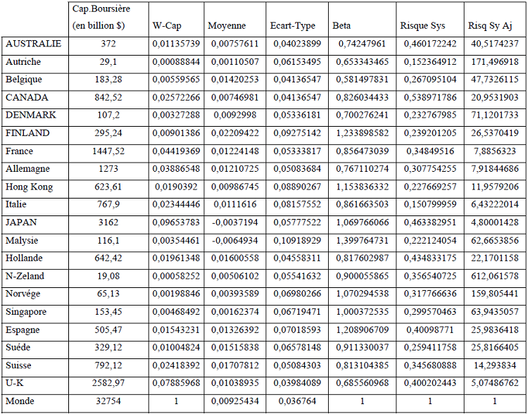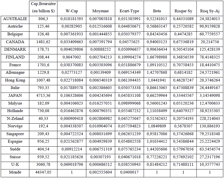 Les rendements des différents indices mensuels ont été déterminés par le logarithme de la première différence des niveaux des indices. Par la suite, nous avons estimé la fraction du risque systématique et non systématique de chacun du marché par rapport au marché mondial en calculant le bêta de chaque marché.